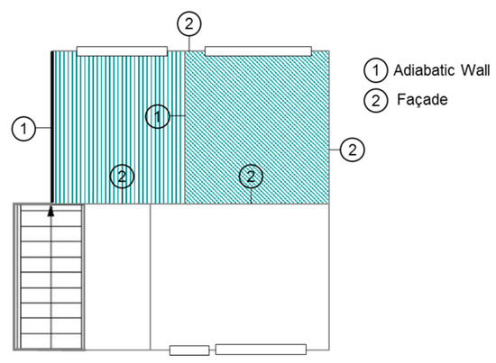 In this paper, while the transient simulations (TRNSYS) are performed to analyze the energy losses in a complete floor including all rooms, the CFD–thermoregulation model is proposed to evaluate the radiant heating ceiling based on detailed thermal comfort analyses. The main challenge in the evaluation of the radiant ceiling systems is the analysis of the thermal comfort criteria in asymmetric thermal environments created by the heating ceiling system. Therefore, it is necessary to consider the asymmetry analyses for the middle and corner rooms that respectively have one and two cool facades. Figure 3 presents an exemplary floor plan, including two rooms with two cool facades on the right and one cool façade on the left. The temperatures of the cool facades depend on the ceiling temperatures, outside air temperatures, and quality of the building envelope. In this study, two types of original and EnEV materials are considered for the building envelope. Figure 4 presents combinations of simulation scenarios that are used for the CFD–thermoregulation simulations. Since the distance of the thermal manikin to the cool facade is regarded as an important factor in thermal asymmetric analyses, two distances of 1 m and 3 m to the coolest façade, which integrates the cool window, are taken into account.