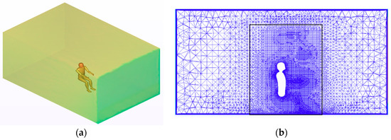 CFD simulations were developed using the SST k-omega turbulence model with the maximum y+ (dimensionless wall distance) value of 8.9 at the room surfaces and 0.7 at the manikin surfaces. This model is a two-equation eddy viscosity model and a hybrid model that combines Wilcox k-omega and the k-epsilon models. Wilcox k-omega is well suited for simulation of flow near surfaces where high shear stress exists, and the k-epsilon model is suitable for the simulation of flow in the regions away from the surface. Therefore, the SST k-omega model is a proper turbulence model for the case that the air velocity in the room and particularly near human and room surfaces is very low. For higher accuracy and at the same time optimizing the number of mesh elements, the fluid domain was divided into two sub-domains: a small domain around the virtual manikin, and a bigger domain between the first domain and the room boundaries (Figure 6b). In the small domain, a mesh growth rate of 1.1, and in the bigger domain, a growth rate of 1.3 were considered as optimal values after some trial and errors. Near the surfaces, 10 prism layers were considered for increasing the accuracy of the convection and radiation heat transfer mechanisms. In total, 3,558,761 and 3,975,839 mesh elements in the fluid domain were defined for the two scenarios of 1 and 3 m.