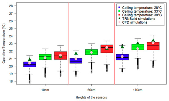 Comparisons between the simulation results of the TRNBuild as well as CFD and the experimental data related to three radiant ceiling temperatures and three heights of sensors (10 cm, 60 cm, and 170 cm). The experimental data are shown in box plots, whereas the TRNBuild and CFD results are shown with triangle and circle symbols, respectively.