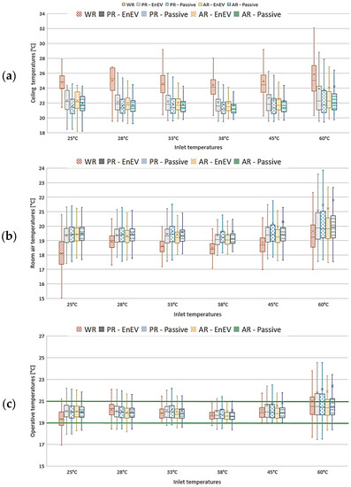 Although radiant heating ceilings in the majority of scenarios—particularly scenarios with supply water temperatures between 28–45 °C—provide desired operative temperatures in all scenarios, median ceiling temperatures for the reference buildings are about 2–4 °C higher than the scenarios with renovations. The higher operating temperatures result in increased energy consumption in the heating supply system and higher energy loss through a low-performance envelope in the reference building. Additionally, the results imply that a ceiling heating that is integrated into a reference building with a low-performance envelope is not able to reach the desired range of operative temperatures if the supply water temperature is below 28 °C. In contrast, when it comes to the other renovation scenarios, such as partial renovation (PR) and ambitious renovation (AR), it can be seen that even with the lower inlet temperatures, such as 25–33 °C, the desired operative temperatures can be satisfied. Undesirably, in these solutions, the change of inlet temperature to either 45 °C or 60 °C causes relatively high fluctuations for the operative and air temperatures, which results in the instantaneous deregulation of the thermal comfort conditions. This might be seen by the large range of the upper whisker presented on the box plot chart, and by the average temperature value being considerably above the median value.