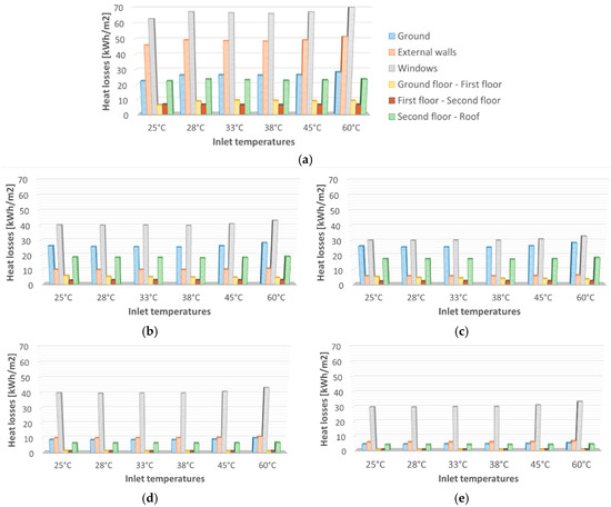 While speaking about energy performance, issues such as the overall heat losses and the primary energy consumption are worth being considered. In Figure 9a–e, the visualization of the heat losses for different renovation scenarios is presented. The analysis of the heat losses indicates that they can be significantly reduced if the building envelope, particularly the facades, are well insulated. For the reference building presented in Figure 9a, the highest losses occur for the windows followed by external walls, reaching the level of 70 kWh/m2 and 40 kWh/m2 in a winter period, respectively. However, these losses can be reduced almost twice for windows and four times for external walls by implementing the EnEV standard, where the U-value of the window and the external walls are changed from 3 W/m2·K to 1.3 W/m2·K and 1.4 W/m2·K to 0.25 W/m2·K (see Figure 9b). If the two ambitious renovation scenarios are considered, namely ambitious renovation (EnEV) and ambitious renovation (Passive House), the losses can be significantly reduced (see Figure 9d–e). The high amount of heat loss between the second floor–roof area and ground–first floor in the reference building is noticeable. Therefore, it is of utmost importance to provide well-insulated materials to reduce heat losses. These heat losses have been minimized in ambitious scenarios of EnEV and Passive House renovations. There is also a minor heat exchange between the floors; however, by renovating the building area, they can be almost eliminated.