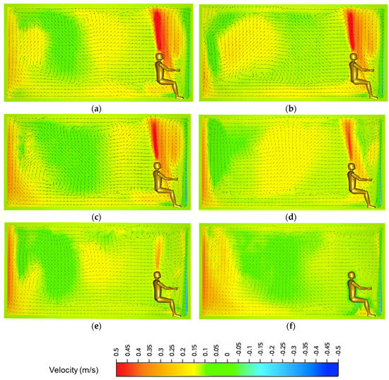 Velocity contour (x-y plane, z = 2 m) of the CFD simulations for the ceiling temperatures of 20 °C (a), 25 °C (b), 28 °C (c), 33 °C (d), 38 °C (e) and 45 °C (f) in the scenario with one low-performance façade.