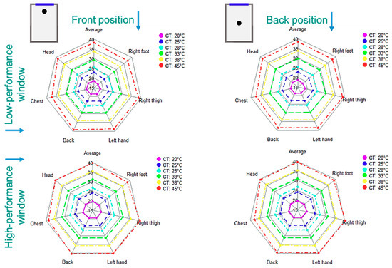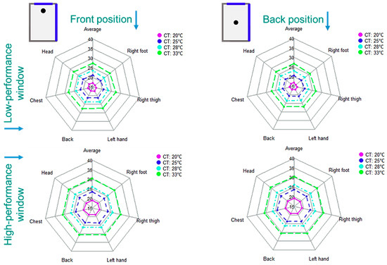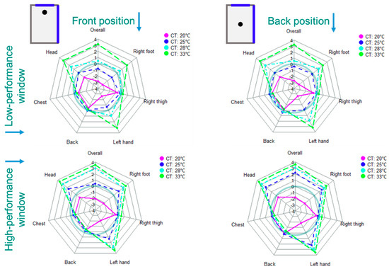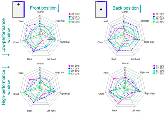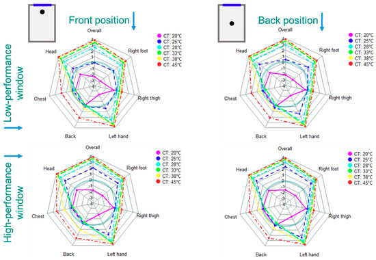 Figure 17 and Figure 18 present the calculated overall and local thermal comfort at the selected six body limbs related to the 40 scenarios listed in Figure 4. It can be seen that the maximum overall comfort condition in the middle room with the low-performance façade and window can be satisfied with a ceiling temperature of 25 °C, while the ceiling temperature of 20 °C can be optimal for the high-performance façade and window. In the corner room with two adjacent surfaces with the outside air, slightly higher ceiling temperatures are required. For the room with a low-performance envelope, the ceiling temperatures of 25 °C and 28 °C provide minimum thermal comfort conditions. However, the ceiling temperature of 25 °C is an optimal temperature. Similar to the middle room, ceiling temperatures of 20 °C and 25 °C in the corner room with a high-performance envelope have about the same impact on the overall thermal comfort condition.