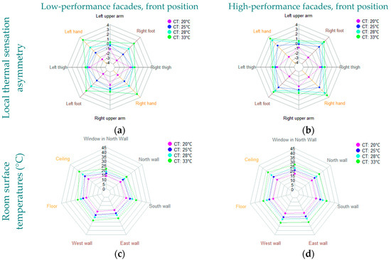 Local thermal sensation asymmetry between right and left sides of selected pairs of the body parts (a,b) and room surfaces’ temperatures (c,d) corresponding to four ceiling temperatures and the qualities of two façades in the corner room.