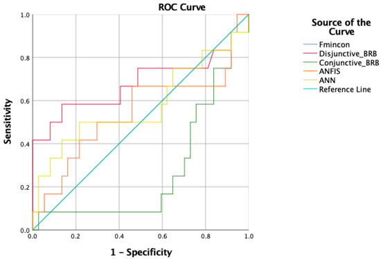 47]. Additionally, the ROC curve is used to assess the accuracy of trained disjunctive and conjunctive BRBs, ANN, and ANFIS for the prediction of