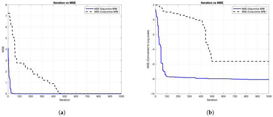 Figure 10. The solid blue line illustrates the decrease of the MSE for the Disjunctive BRB during each iteration. The initial MSE was 4.111466, which decreased to 0.000281 after the 1000th iteration. The dashed line represents convergence for the Conjunctive BRB. The initial MSE for the Conjunctive BRB was 7.235699, which decreased to 0.003566 around the 499th iteration, after which it became fixed. Even though the BRBaDE reached a steady state for the Conjunctive BRB in fewer iterations, it had a more accurate result for the Disjunctive BRB. For better visualization of the convergence of the BRBaDE, the MSE value was been converted to LOG scale as shown in
