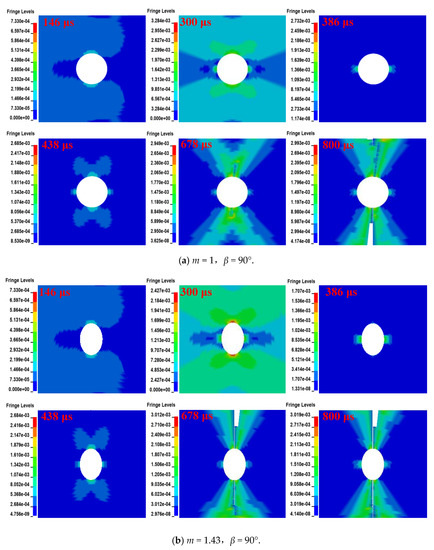 The high-speed camera images showed that the dip angle β = 90°. When the incident compressive stress wave passed through the hole, there was some rock debris ejection at the upper and lower positions of the holes, whereas such phenomena did not appear at other positions. This shows that powder-like particles pop up when the axial ratio is small. As the axial ratio increases, the number of ejected debris and debris size increase, but at this time only as small debris without cracks. When the reflective tensile stress wave gradually returns and re-incidents through the hole, a crack gradually forms at the upper and lower positions. Moreover, the crack slowly stretches along the upper and lower positions. Figure 4 shows that there were some differences in the time of the crack initiation and elongation around the hole under different axial ratios. The crack initiation at an axial ratio of 2.5 occurred earlier than that related to the other two axial ratios. At t = 533 μs, signs of a crack appeared in the upper part of the hole. At t = 589 μs, the crack notably formed and the width of the crack was greater than that of the other two axial ratios. Similarly, in comparison with the cracks of m = 1.43 and m = 1, signs of cracking appeared in the upper and lower parts of the hole at t = 589 μs and m = 1.43, which were especially notable in the upper part. At the same time, only a tiny crack appeared in the upper part of the hole related to m = 1; the signs of cracks in the lower part were not stronger. At t = 828 μs, the crack around the hole had completely formed for each axial ratio. In contrast, the width of the crack was significantly different, that is, the width of the crack with a high axial ratio was greater than that of the crack with a low axial ratio.