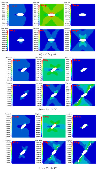 With an increase in the axial ratio, the time of the failure of the hole moved ahead of schedule. Figure 9 shows that the larger the axial ratio, the greater the high effective strain produced by the compressive stress wave. When m = 5, the strain region that appeared at the upper and lower positions of the elliptical holes was larger than that of other axial ratios. These phenomena indicate that the axial ratio affected the dynamic stress concentration.