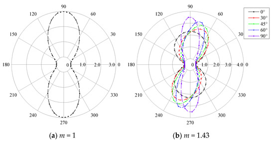 Second, in the case of m = 1.43 and 2.5, kCMDSCF under the compressive stress wave resembled linear growth with a gradually increasing dip angle and the linear rate under the high axial ratio was higher than that under a lower axial ratio. The kTMDSCF under the tensile stress wave considerably fluctuated with the increasing dip angle and the whole trend of m = 1.43 steadily rose. However, in the case of m = 2.5, kTMDSCF was different before and after β = 60°. It resembles linear growth before β = 60° and the growth rate was large, while it decreased after β = 60° and the growth rate was small.