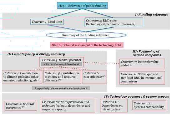 These ideas are reflected in Germany’s 7th Federal Energy Research Program (EFP), entitled “Innovations for the Energy Transition” and adopted in 2018 []. In the 40 years of its existence, the EFP has been repeatedly adapted to new societal challenges. To prepare for the 7th EFP, the “Technologies for the Energy Transition” research project [] analyzed a large number of technologies with regard to their development status, their potential for growth, and their possible research needs. To do so, the project carried out a systematic comparative multi-dimensional analysis. It assessed these technologies with regard to their abilities to meet the requirements of the energy industry, as well as climate policy, their capacity to help leading German companies continue to expand, and their likelihood of securing technological options by promoting technology on a broad front. The analysis employed a total of 12 different criteria (see Figure 1). Due to the nature of the requirements for this analysis, the criteria were neither quantified nor weighted, and the different technologies were not ranked.