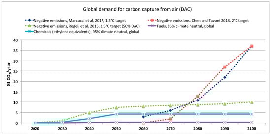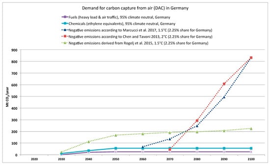 The second aspect to consider is the necessary effort to globally achieve negative emissions. As Figure 2 illustrates, the global demand for DAC, as modeled by Chen and Tavoni [] and Marcucci et al. [], far exceeds those quantities required by PtL and PtC, which are assumed to remain constant from 2050 onwards. In comparison, the more moderate global demand derived from Rogelj et al. [], by assuming that 50% of the stated negative emissions may be achieved by DAC, is in the same order of magnitude as the demand for PtC. Figure 3 shows the proportion of CO2 required for negative emissions for which Germany might be responsible, in comparison to the demand of 80 Mt/year that is required by PtL and PtC domestically.
