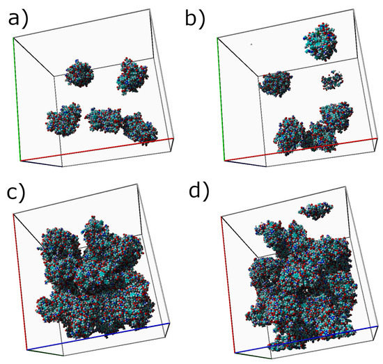 The molecular initial (a,c) and final (b,d) structures of mucin solutions, for two representative concentrations ( and ), are presented in Figure 2. For the lowest concentration, the proteins were able to move freely in the simulation box, following a near random walk until meeting. Three mucin molecules eventually formed an easily-breakable aggregate (having few intermolecular interactions, presented in the next Subsection). For the highest concentration, , initial and final arrangements (Subfigures c and d) looked very similar due to the creation of a more stable network, whose formation was enhanced due to crowding in the system. Differences between the initial and the final structures can be better investigated through the parameters discussed in the previous section.