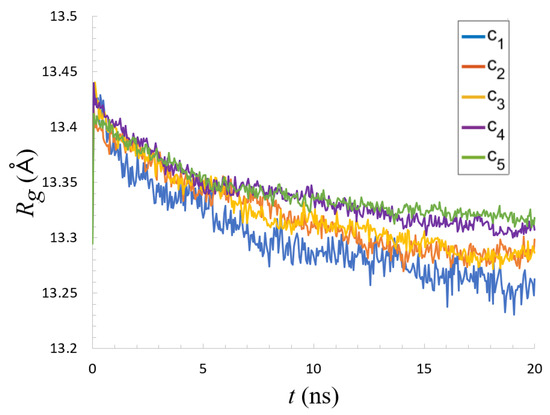 According to Equation (2), the average radius of gyration, , of a mucin as a function of time is presented in Figure 3. This offers some information on the overall geometric changes occurring to a chain throughout the simulation.