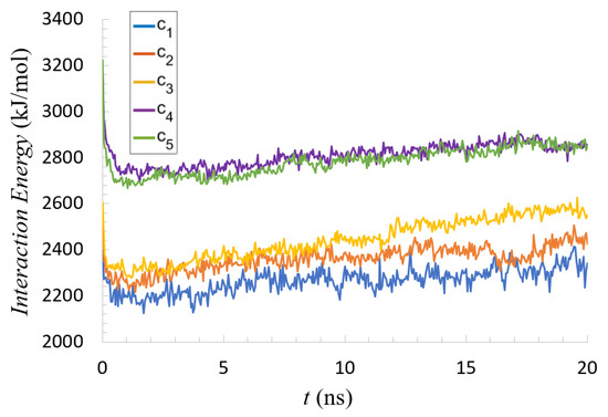 Interaction energies (per one mucin molecule originating across all simulation runs) as a function of time.