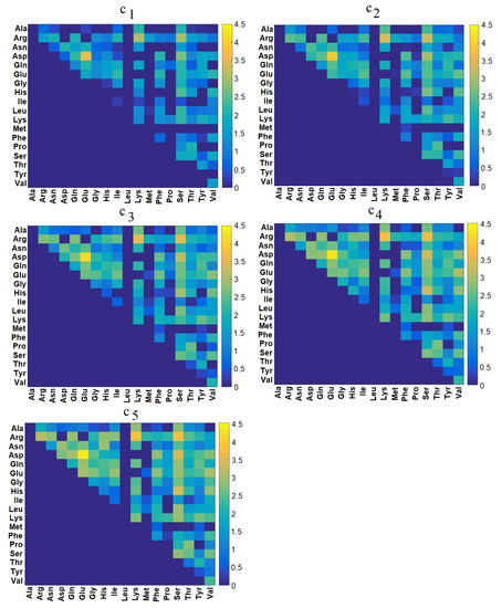 All five cases appeared similar, but the trend of increasing energy with concentration revealed a crowding effect; it was not simply linear. Despite the mucin concentration increasing in even steps, there was a clear transition between and . Interesting features can also be seen in the binding tendencies between individual AAs. Maps of these interaction energies are depicted in Figure 5.