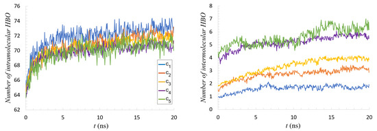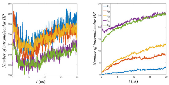 For example, the relative number of intermolecular HBO interactions to total HBO interactions was about 2% for , 4% for , 5% for , 7% for , and 8% for . This is due to the fact that the conformation taken from PDB was the protein’s folded state, so the number of intramolecular interactions was maximized at the start of the simulation.