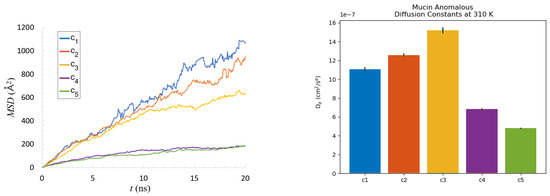 Analyzing the MSD of the particles is important due to its relation to the mechanical response functions of the system through the generalized Stokes–Einstein relation (see Equation (2) in [36]). It is interesting to consider of what type of motion the MSD is representative. A detailed analysis is presented in the next paragraph (cf. Section 2.2). Because macromolecular systems often exhibit anomalous behavior, we tested if the throughout as in Equation (4). Values of the fitting parameter are shown in Table 2 and values of generalized (or fractional) diffusion coefficient are depicted in Figure 8 right. The fitting was done using the Python MDAnalysis Toolkit [47].