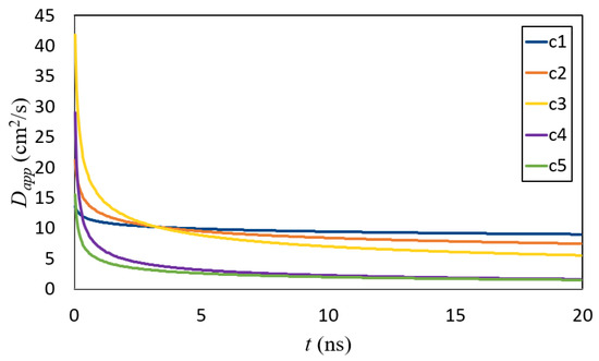 where is a generalized self-diffusion coefficient (a constant that does not depend on time and is of the dimension of ) [39,40]. An exponent represents anomalous diffusion ( represents normal diffusion). In normal diffusion, the diffusion coefficient obeys the Stokes–Einstein law,