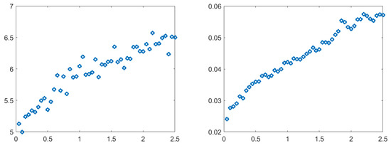 Parameter is a random variable that yields valuable information when we consider only small , i.e., when is much smaller than the length of the series N. If the process , which underlies the recorded signal, follows from a continuous-time random walk, then , where denotes a similar distribution. By taking different time dependencies, the sample MSD will reveal whether our process is better modeled as a CTRW or FLSM [43].