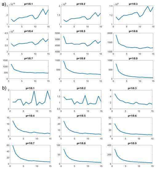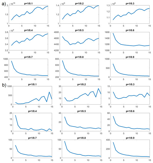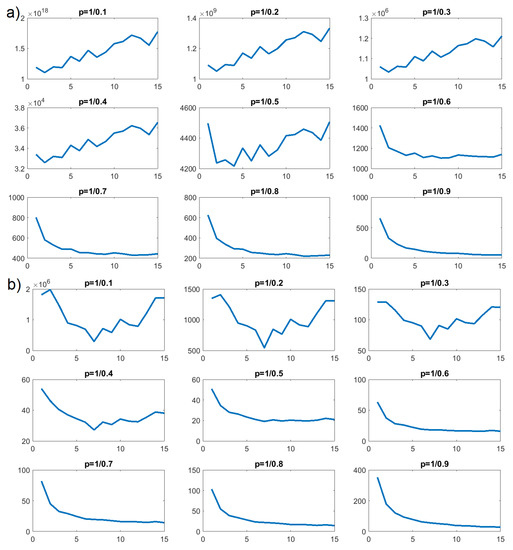 In Figure 12b, we can see that values of as a function of n increased for , , and , but decreased for and all further values of p. Such a property is characteristic of an FBM process. We performed the same tests on the number of intermolecular HBO interactions for concentration . The results of the p-variational are presented in Figure 12a and similarly confirmed that CTRW would be a poor stochastic model for describing the time evolution of intermolecular HBO interactions. Here, the clear increasing trend persisted until . Around , this trend changed and decreased for the remaining values; , , , and . This, again, is a property characteristic of FBM processes.
