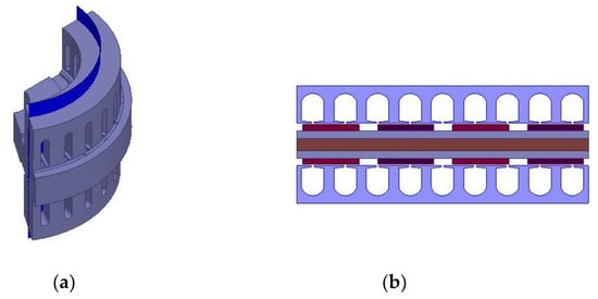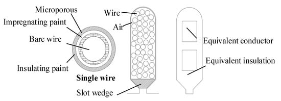 To simplify the analysis, an equivalent model of the stator winding was established, introducing an equivalent conductor that replaced the winding copper wire and an equivalent insulating layer of all the insulating materials in the slot, as shown in Figure 25.