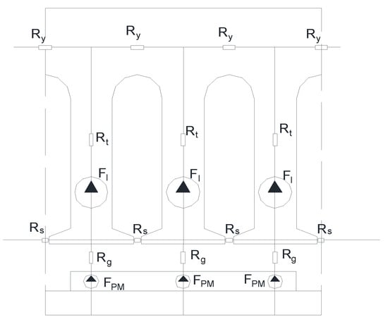 The AFPMSM is equivalent to a linear motor in this paper, and the magnetic circuit analysis method (MCAM) model was used to analyze the air gap magnetic density distribution of AFPMSM [,,,]: