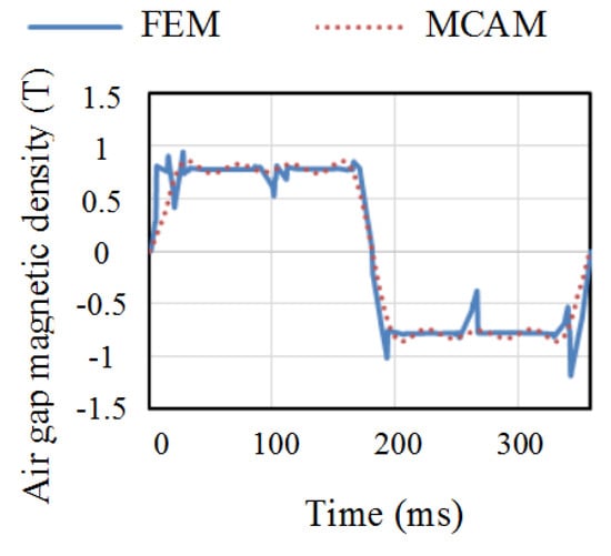 The air gap magnetic density of the motor has a crucial influence on the saturation degree of the motor, the output power requirement, and the loss level. Therefore, it is important to analyze the air gap magnetic density of the AFPMSM. Figure 4 shows that the air-gap magnetic density distribution waveforms calculated by the FEM and the MCAM are basically the same, and the FEM can more accurately consider the cogging and magnetic flux leakage of the motor, so the calculation accuracy is higher than the analytical method. However, the MCAM takes a short time and can be used for screening the initial design of the AFPMSM.