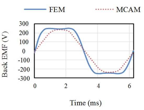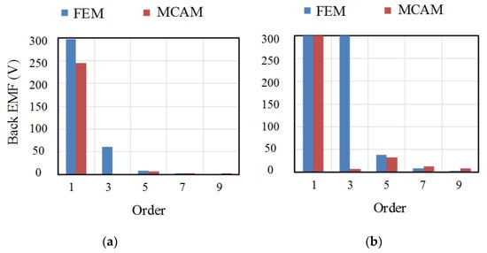 Figure 5 is a comparison of the analytical results of the FEM and MCAM of the AFPMSM back EMF. It can be seen from Figure 6a,b that the MCAM has omissions in the analysis of the third harmonic magnetic density, and the analysis results of the fundamental wave and other harmonics are in good agreement with the finite element method.