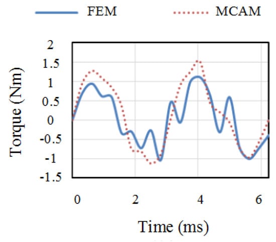 Figure 7 shows that that the MCAM is basically consistent with the analysis of the positioning torque and the finite element analysis results, and the maximum amplitude difference is 0.2 Nm, which satisfies the initial design accuracy requirements of the motor.