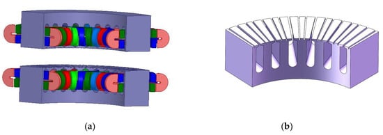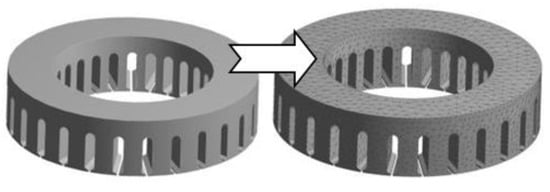 Firstly, a 3D finite element modal simulation model of the AFPMSM stator structure was established. The stator core structure has an elastic modulus of 205 GPa, a Poisson’s ratio of 0.27 and a density of 7305 kg/m3. Figure 18 shows the stator structure finite element simulation model and mesh segmentation diagram.