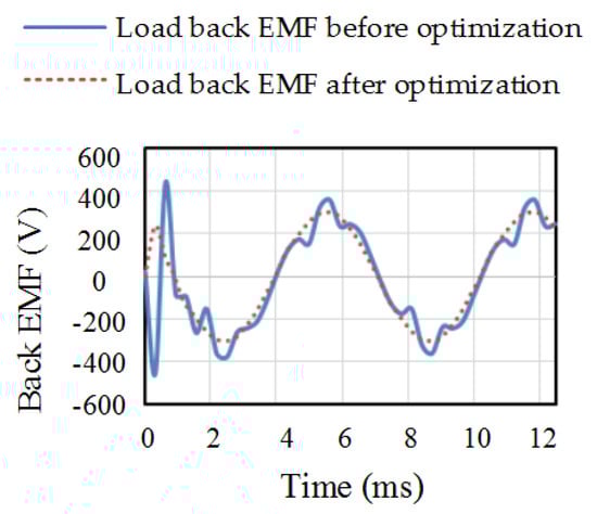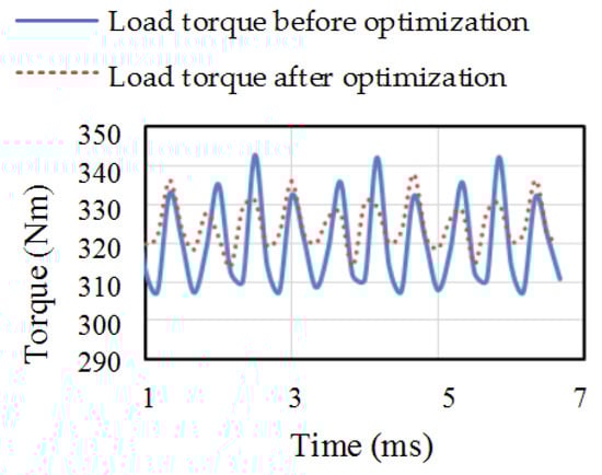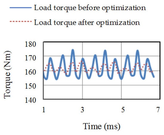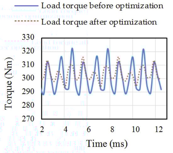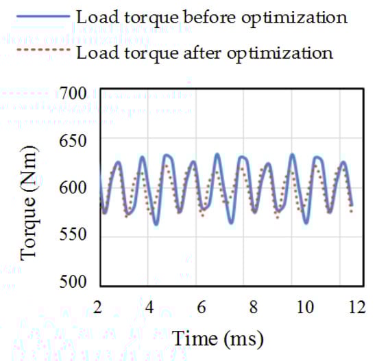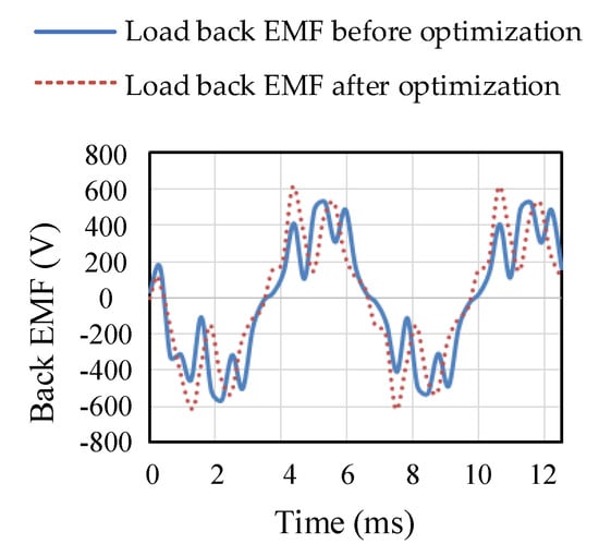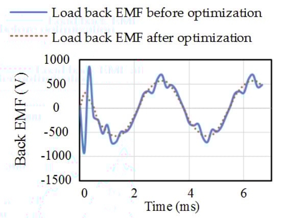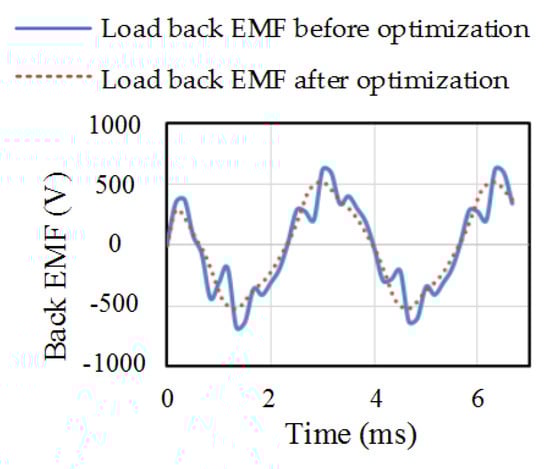 Figure 15 shows that the load back EMF waveform is significantly optimized under the peak load power speed of 3000 rpm. Figure 16 shows that the load torque peak-to-peak value of the auxiliary slot optimization method is 10 Nm when the rotation speed is 3000 rpm, and the peak-to-peak value of the load torque before optimization is 16 Nm. The torque ripple of the auxiliary slot method is reduced by about 2%. Therefore, the torque ripple optimization method of the auxiliary slot can effectively attenuate the load torque ripple under constant power conditions and peak load conditions.