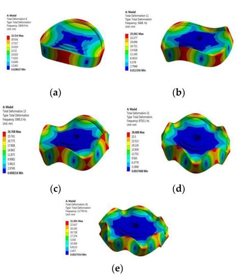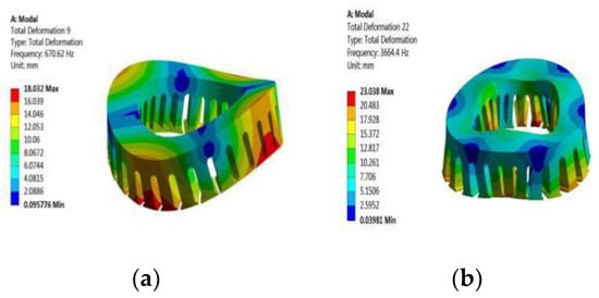 The finite element modal simulation model of the automotive AFPMSM rotor structure was established, and the natural frequency and vibration mode of the rotor structure were obtained, as shown in Figure 22.