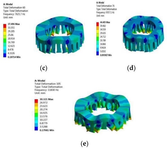 Finite element simulation model of the stator core. (a) Second order model. (b) Third order model. (c) Fourth order model. (d) Fifth order model. (e) Sixth order model.