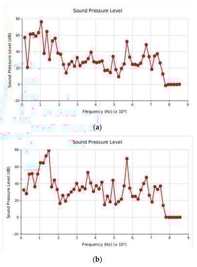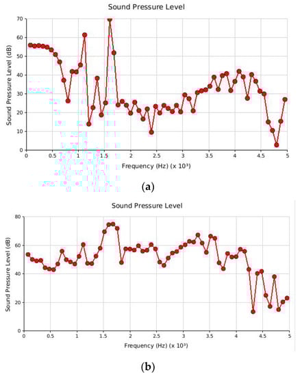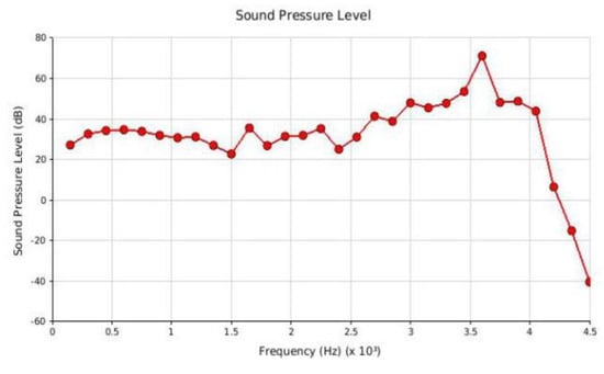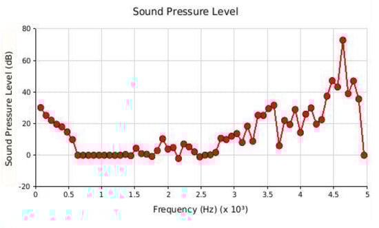 The electromagnetic noise of the rotor structure of the motor was simulated, and the noise sound pressure level results of the respective frequency components were obtained as shown in Figure 23 and Figure 24. Since the peak load electromagnetic noise is greater than the rated load electromagnetic noise, the rotor section only shows the electromagnetic noise under peak load conditions.