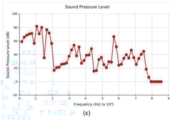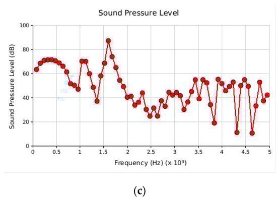 Stator system electromagnetic noise at 1600 rpm. (a) Electromagnetic noise at no load. (b) Electromagnetic noise at rated load. (c) Electromagnetic noise at peak load.