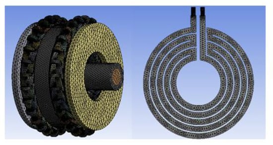 The axial flux motor is meshed, and the split model of each part of the motor is shown in Figure 27. The whole motor is divided into 17,346,364 individual cell grids and 3,412,225 nodes.
