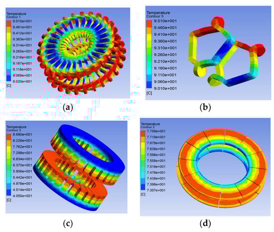 Thermal simulation of the motor was conducted based on ANSYS/Workbench. The inlet water flow rate was 0.8 m/s, the ambient temperature was 30 °C, and the inlet coolant temperature was 25 °C. The rated torque operating point of 50 kW and 1600 r/min was selected, and the motor temperature distribution as shown as Figure 28 is when the motor reached the thermal steady state for a long time.