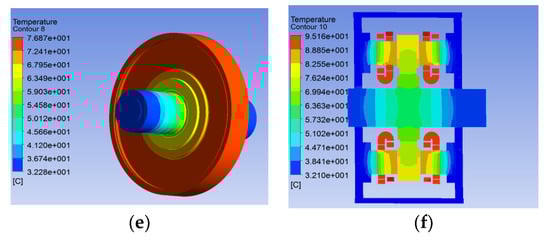 Temperature map of each part of the AFPMSM. (a) Winding temperature cloud map. (b) Upper and lower winding temperature cloud map. (c) Stator core temperature cloud map. (d) Permanent magnet temperature map. (e) Rotor and shaft temperature cloud map. (f)Whole machine section temperature cloud map.