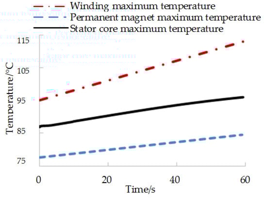 Considering the operating conditions of the actual electric vehicle, the temperature rise of the motor is further checked by operating the peak torque for 60 s after assuming that the rated operation of the motor reaches a thermal steady state. The temperature rise of the motor components over time during the 60 s operation of the motor with peak torque is shown in Figure 29.