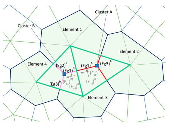 Definition of the potential fracture location in MDEM (Modified Discrete Element Method), showing the element definition, after failure. The arrows show the contact of normal and shear forces, Fn and Fs, respectively.