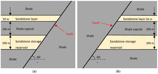 Diagram of the simulation domain. (a) Sandstone formations are in the hanging wall; (b) Sandstone formations in the footwall. Note that these diagrams are schematic and do not show the fault structure (process zone).