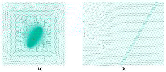A triangular mesh was used for the elements prior to failure (Figure 3). Adaptive meshing was implemented to account for stress concentration in the vicinity of the fault and the corners defined by the fault and rock layer boundaries, where the element size is significantly reduced compared to elsewhere in the domain. Figure 3 shows that the mesh is created such that the fault area is marked by elements forming perfect straight-edged parallelograms. The reason for this was to avoid random computation of the fault zone placement in the domain and to avoid sharp angle effects. Away from the fault, where no large stress gradients are to be expected, the mesh is created coarser in order to minimize the needed computation time. A total of 44,700 triangles make up the mesh.