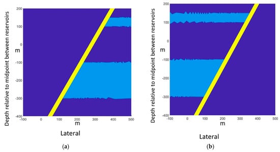 Assignment of rock types to the domain elements. Dark blue: shale (caprock, underburden, overburden, and footwall at left (a) or hanging wall at right (b)). Light blue: sandstone (lower and upper reservoirs). Yellow: fault damage zone (process zone). Axes: distance in meters.