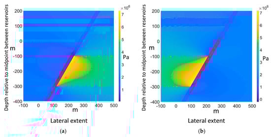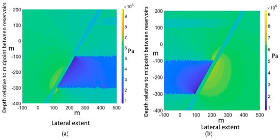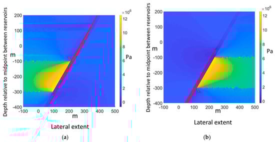 (a) For reservoirs in the hanging wall, no shear fracture is seen to propagate up along the fault, even when the pore pressure reaches 17 MPa (11 MPa initial pore pressure). The failed elements are shown in red; (b) For reservoirs in the footwall, the picture is reversed, with a handful of fractures appearing at the lower reservoir’s top corner. Effective horizontal stress is plotted, scale in Pa.