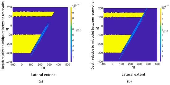 The process zone around the fault represents sheared and fractured shale (different from mostly clayey gouge at the center of the fault), which is modeled here as a mechanically damaged version of the intact shale elsewhere in the domain. Therefore, its absolute permeability should be at least equal if not higher than intact shale. This is in accord with a previous evaluation of permeability along faults []. A value of 10 nD was assigned to intact shale permeability, while for the process zone, a value of 10 µD was chosen []. The sandstone layers were given a permeability of 1 mD. Although much lower than typical for the best sandstone reservoirs, large-scale storage will dictate the use of all available reservoirs, including tighter sands. This has also no effect in our simulations, as the pressure gradient in transient filling of the reservoir is not modeled, only the resulting pressure gradient along the fault as steady-state reservoir pressure is achieved. Failed elements are given a permeability of 10 mD, or a factor 1000 larger than intact elements in the process zone. The assigned permeability values are summarized in Table 2. A permeability distribution map is shown in Figure 8 for two cases where fracturing has occurred.