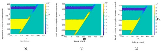 Map of pore pressure distribution after setting a 10 MPa initial pressure difference between the lower and higher reservoir and turning off the fracturing simulator. (a) and (b) Partial fracturing along the fault’s process zone; (c) A leakage path has been established between the two reservoirs; thus the pressure equilibrates in the long-term. Pore pressure in Pa.