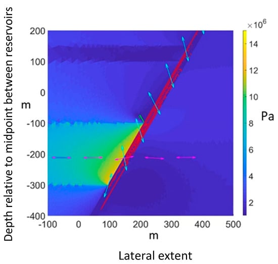 Visualization of principal stress rotation near the fault; maximum principal stress along the fault: light blue, minimum principal stress along the lower reservoir’s central line: pink. Horizontal effective stress magnitude in Pa.
