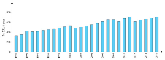 In 2012, the International Marine Organization (IMO) announced that global NOx and SOx emissions from world shipping exhibits approximately 15% and 13%, respectively [8]. Further, it illustrated that for entire international shipping, the CO2 emissions are found to be 2.2% of the global CO2 emissions whereas the CO2 emissions from the entire world shipping is noted to be 2.6%. IMO predicts that by 2050, CO2 emissions from entire international shipping might raise by 50–250%. Figure 1 illustrates CO2 emissions produced by international shipping from 1990 to 2016.