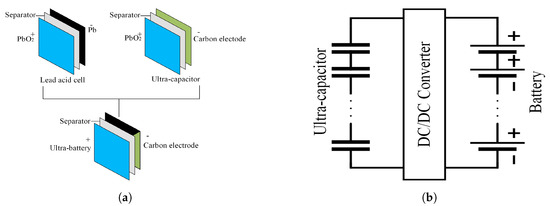 In the literature, HESS consisting of battery and ultra-capacitor has been extensively studied for several applications such as in transportation [42], stand-alone PV [43], and terrestrial microgrids [44]. As high power and high energy density can not be achieved by a single ESS, there is an utmost need to hybridize a higher power density device with a high energy density device. The life-cycle of a battery is found out to be quite low usually in the range of 1500–4500 cycles, and low power density (below 1 kW/kg) whereas an ultra-capacitor has high power density (above 10 kWh/kg) and long life-cycle. Hence, these energy storage technologies can be hybridized. There are two possibilities to hybridize them either internally or externally. In the internal hybridization, the devices are hybridized at the electrode level as depicted in Figure 2a. Ultra-battery is an example of internal hybridization in which lead-acid battery is hybridized with ultra-capacitor [45]. In this study, a hardwire connection is considered as shown in Figure 2b.