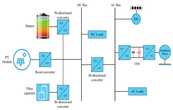 The proposed model depicted in Figure 3 consists of the PV generation system, diesel engine, BESS, ultra-capacitor, boost converter, buck-boost converters, active front end converter, and an inverter. The ultra-capacitor and battery are connected using buck-boost converter in parallel with the dc-link capacitor so it enhances the stability of the shipboard microgrid. The total power flow in the proposed model is depicted in the Equation (1).